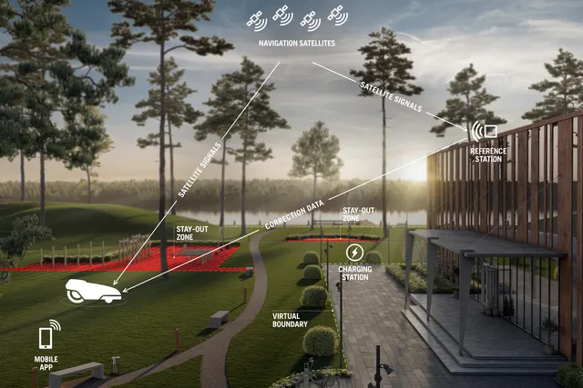 Virtuell, drift utan begränsningskabel genom satellitbaserad RTK-GNSS-teknik, möjliggör en noggrannhet ner till cirka 2 cm. Frånvaron av fysiska begränsningskablar innebär en ny nivå av härdighet och flexibilitet, vilket tillåter regelbunden luftning och reparation av gräs utan att äventyra robotinstallationens funktion.
